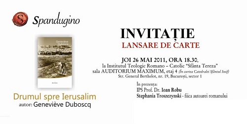 Arhiepiscopia Romano-Catolică de Bucureşti va invită joi, 26 mai la ora 18.30 la Lansarea volumului „Drumul spre Ierusalim” ce va avea loc la Institutul Teologic Romano Catolic „Sf. Tereza” din Bucureşti în sala Auditorium Maximum.