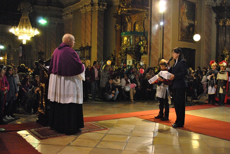 După scenetă a urmat un scurt moment de rugăciune încheiat cu un nou grup de cântece şi cu binecuvântarea finală primită de la pr. Vicar General. Înainte de a pleca în procesiune înapoi spre şcoală, cu lampioanele specifice acestei sărbători şi cu cântece, copii au înmânat părintelui două puşculiţe în care au strâns bani pentru cei de aceiaşi vârstă cu ei, dar mai puţin binecuvântaţi cu atâtea bunătăţi. În încheiere, părintele le-a mulţumit copiilor pentru gestul lor, pentru frumosul program, dar şi catehetei Gabriela Burmann şi părinţilor pentru implicarea şi participarea în acest frumos moment.