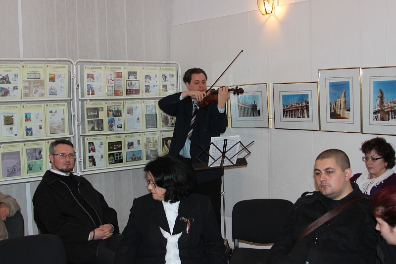 În program au fost prevăzute o apreciată expoziţie filatelică şi una de carte, dedicate Papei Benedict al XVI-lea, precum şi o expoziţie de fotografii din Roma, toate din colecţiile preşedintelui Forumului Democratic al Germanilor din judeţul Caraş-Severin, Erwin Josef Ţigla. Incursiuni muzicale au fost efectuate la vioară de prof. George Gassenheimer, cadru didactic la Liceul de Arte „Sabin Păuţa” din Reşiţa. Organizatorii s-au pregătit pentru aproximativ 25 de participanţi, marea surpriză fiind faptul că peste 70 de persoane, aparţinători la diferite grupe de vârstă, confesiuni creştine şi etnii, au fost prezenţi la manifestarea de înaltă încărcătură spirituală. În introducere, organizatorul principal, Erwin Josef Ţigla, a dat citirii cuvântului Papei Benedict al XVI-lea din 11 februarie a.c., prin care îşi anunţa retragerea de pe scaunul petrin. Au fost citite de asemenea un interviu dat de Cardinalul Francis Arinze din Nigeria, precum şi cuvintele Patriarhului Ecumenic al Constantinopolului, Bartolomeu I, la aflarea veştii privind retragerea Suveranului Pontif.