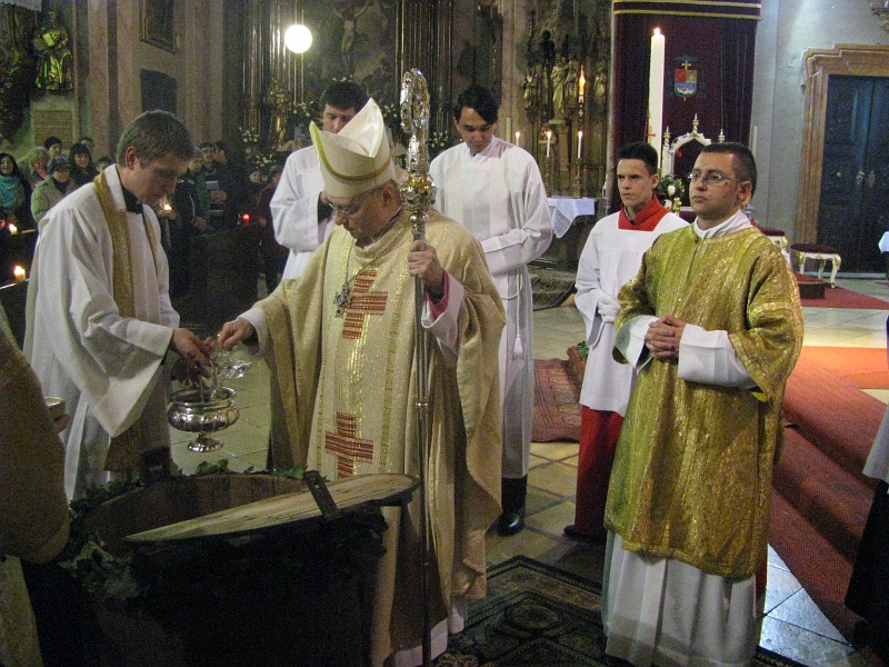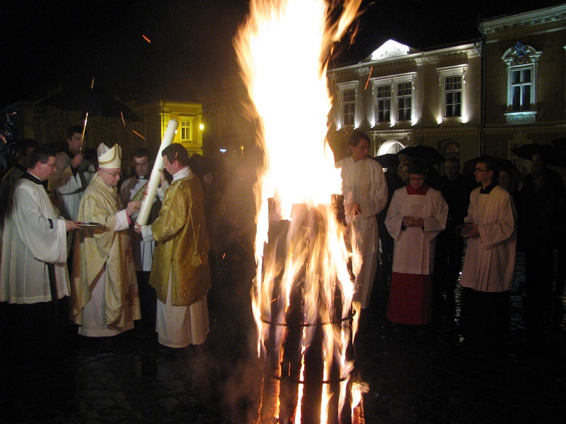 Pe o ploaie măruntă, dar totuşi rară, care nu i-a împiedicat pe credincioşi să participe în număr mare la celebrarea Învierii, Episcopul diecezan, Excelenţa Sa dr. h.c. Martin Roos, preoţii, diaconii şi asistenţa au ieşit, prin Catedrala cufundată în întuneric, în Piaţa Unirii, unde a avut loc binecuvântarea focului şi aprinderea lumânării pascale, de la acesta. Diaconul Noviţa Drăghia a intonat în mod solemn de trei ori aclamaţia „Lumen Christi!”, credincioşilor fiindu-le împărţită lumina de la lumânarea pascală. Astfel, Domul s-a umplut treptat de luminiţe, iar lumânarea pascală a fost aşezată, la loc de cinste, în partea centrală a catedralei. Au urmat imnul „Exultet” cântat în limba latină de diaconul Daniel Pozsonyi. Rugăciunile, lecturile, şi psalmii, au fost citite, respectiv intonaţi, succesiv în trei limbi, de către celebrantul principal, respectiv de diaconi şi de studenţii teologi.