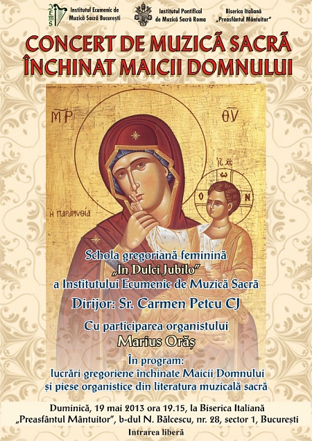 14.05.2013, Bucureşti (Catholica) - Duminică, 19 mai, ore 19.15, va avea loc un Concert de muzică sacră închinat Maicii Domnului, organizat de Institutul Ecumenic de Muzică Sacră la Biserica italiană Preasfântul Mântuitor din Bucureşti, concert ce va fi susţinut de schola gregoriană feminină In Dulci Jubilo condusă de sr. Carmen Petcu, cu participarea organistului Marius Orăş.