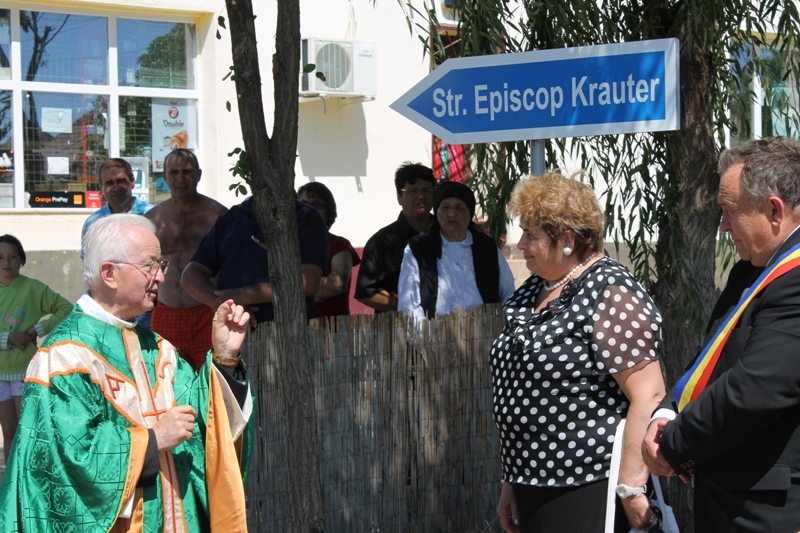 După Sfânta Liturghie, după ultimele acorduri ale frumoaselor şi emoţionantelor imnuri mariane germane, pe peretele faţadei bisericii a fost dezvelită o placă comemorativă în memoria celui care a fost Sebastian Kräuter, capelan, respectiv paroh al acestei comunităţi timp de peste 40 de ani, dar şi ordinariu, respectiv Episcop de Timişoara între 1983-1999. Momentul a fost onorat de prezenţa autorităţilor locale, reprezentate de primarul Virgil Bunescu, precum şi de o fanfară militară, care a intonat mai multe cântece şi marşuri festive germane. Momentul a fost unul deosebit de emoţionant, mai ales că pentru mulţi dintre foştii credincioşi ai parohiei Giarmata, părintele Sebastian Kräuter a fost cel care i-a condus, de la momentul botezului, la masa Euharistică şi până la altarul de căsătorie, multora conferindu-le ulterior, ca ordinariu şi Episcop, Sf. Mir, dar mai ales dându-le o educaţie temeinică şi profund creştină şi catolică. Tot în onoarea Episcopului Sebastian Kräuter a fost botezată şi o stradă din Giarmata, care de acum înainte îi va purta numele. Şi acest moment, al redenumirii acestei străzi, a fost marcat cu această ocazie, după Sf. Liturghie.