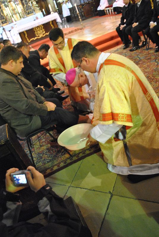 După un scurt moment de adoraţie în tăcere al tuturor celor prezenţi, tinerii din grupul „Jubilate” şi membrii corului „Exultate” au pregătit şi organizat adoraţia la Preasfântul Sacrament până la orele 21.45. De pe altarele Domului, începând cu cel principal şi continuând cu toate cele secundare – cu excepţia celui în care se păstrează Sf. Euharistie – au fost îndepărtate toate ornamentele, antipendiile, feţele de altar şi sfeşnicele, semn al faptului că ne aflăm într-un timp special, un timp profund, al momentului în care Cristos asudă sânge pe Muntele Măslinilor, vândut fiind de Iuda, un timp în care Biserica pune accent pe meditarea mai în profunzime a misterului răscumpărării noastre. Ocaziile de Sf. Spovadă, oferite în seara de Joia Mare între orele 17.00-18.45, s-au repetat şi după Sf. Liturghie aproape până la orele 22.00. (text: Claudiu Călin; foto: Adrian Păşcălău-Kollár)