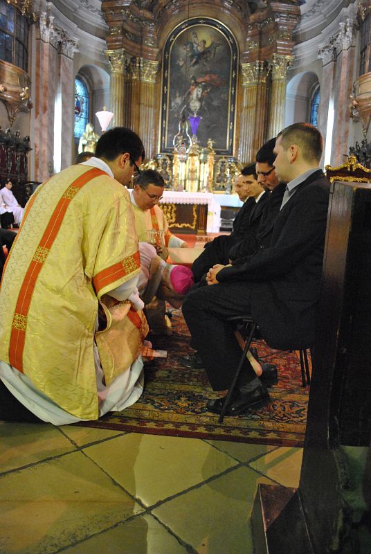 După momentul predicii, Episcopul, împreună cu doi acoliţi şi cu ceremonierul episcopal, s-au îndreptat spre grupul celor doisprezece bărbaţi, aşezaţi în faţa altarului, pe două rânduri, şi aleşi din mai multe categorii de vârstă, origine şi limbă maternă: au fost prezenţi tineri din două grupuri de tineri studenţi, „Jubilate” (lb. română) şi TEKMEK (lb. maghiară), dar şi bărbaţi adulţi, angajaţi, capi de familii, care cu fidelitate sunt mereu aproape de Biserică. Diversitatea celor doisprezece bărbaţi care au participat la ritualul spălării picioarelor doreşte să evidenţieze diversitatea chemărilor Bisericii, dar şi diversitatea lingvistică şi culturală a poporului catolic din cuprinsul Diecezei de Timişoara, iar mai presus de toate unitatea în credinţă a acestui popor credincios.
