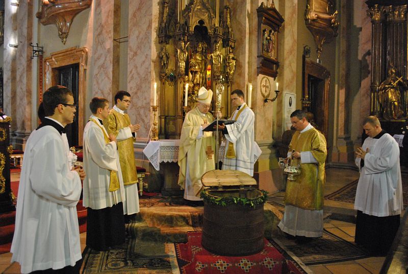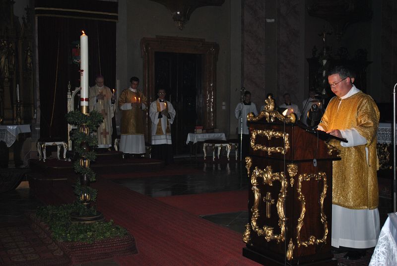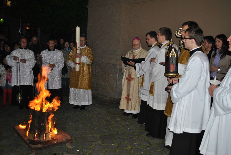26.04.2014, Timişoara (Catholica) - Vigilia Pascală, adică celebrarea Învierii Domnului nostru Isus Cristos, sau cea mai mare şi mai sfântă dintre toate veghile Bisericii a fost celebrată în Sâmbăta Mare, 19 aprilie a.c. la Timişoara şi în acest an în Domul Sf. Gheorghe, Catedrala Diecezei de Timişoara, începând cu orele 22.00. Cu câteva momente înaintea începerii celebrării, credincioşii reuniţi în Dom au avut ocazia de a le fi explicată celebrarea Vigiliei din detaliile oferite pe marginea întregii celebrări, explicaţii citite în trei limbi de pr. Nikola Lauš, cancelar diecezan.