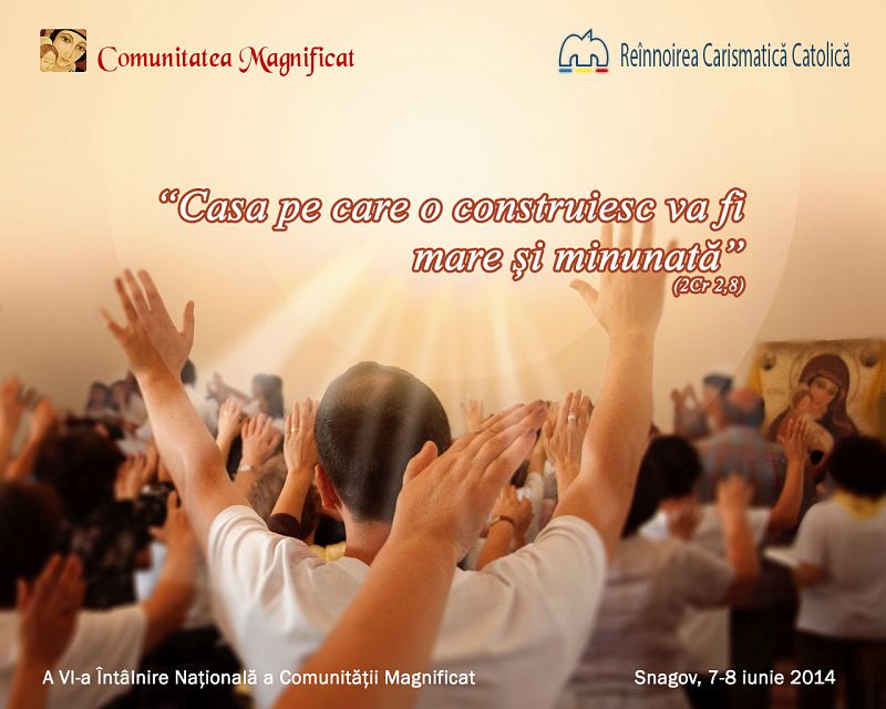 12.06.2014, Bucureşti (Catholica) - În zilele de 7-8 iunie, cu ocazia Solemnităţii Rusaliilor, în Mănăstirea Părinţilor Carmelitani Desculţi din Ciofliceni (Snagov), Comunitatea Magnificat a organizat a VI-a Întâlnire Naţională la care au participat aproape 200 de membri din oraşele unde Comunitatea este prezentă actualmente (Bucureşti, Bacău, Râmnicu Vâlcea, Popeşti-Leordeni şi Alba Iulia), dar şi invitaţi din alte localităţi ale ţării. Tema întâlnirii a fost inspirată de un verset din 2Cor 2,8, „Casa pe care o construiesc va fi mare şi minunată”.