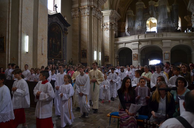 18.06.2014, Timişoara (Catholica) - Sâmbătă, 14 iunie 2014, începând cu orele 11.00 a avut loc pelerinajul ministranţilor, respectiv întâlnirea ministranţilor din Dieceza de Timişoara la Sanctuarul marian de la Maria-Radna. Acest pelerinaj al micilor slujitori ai lui Cristos, devenit deja tradiţional în ultimii ani, a reunit peste 500 de ministranţi şi copii din majoritatea parohiilor din Dieceză. Programul a început cu Sfânta Liturghie solemnă celebrată de Excelenţa Sa Martin Roos, Episcop de Timişoara, în concelebrare cu peste 20 de preoţi, parohi şi capelani, care i-au însoţit pe micii lor colaboratori la altarul Mariei de la Radna. Predica a fost rostită de pr. Toman Zoltan şi p. István Barazsuly SDS ún limbile română, germană şi maghiară, cei doi tineri preoţi vorbind ministranţilor şi copiilor prezenţi despre rolul lor la Sfânta Liturghie, dar şi al Sfintei Liturghii pentru fiecare om, pentru fiecare copil al lui Dumnezeu şi despre apropierea de aproape de altarul euharistic, de locul unde şi de momentul în care Isus, prietenul tuturor copiilor, coboară zilnic prin mâinile preotului pentru fiecare dintre noi.