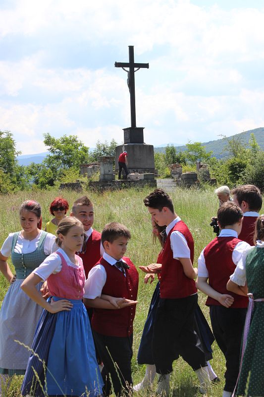Organizată de parohie şi de Forumul Democrat al Germanilor din Reşiţa, aniversarea s-a bucurat de sprijinul unui grup inimos format din 40 de oameni, credincioşi ai parohiei, dar şi reşiţeni. Pe timp frumos, după un urcuş nu totdeauna uşor, grupul de credincioşi reuniţi la 28 iunie orele 12.00 în jurul pr. Pál József Csaba, parohul locului şi a lui Erwin Josef Ţigla, preşedintele Forumului German din localitate, s-au regăsit în rugăciune şi cântece lângă vechea cruce din vârful dealului. Momentul având loc la aniversarea a o sută de ani de la atentatul de la Sarajevo, asupra arhiducelui Franz Ferdinand, intenţiile de rugăciune au fost pentru pace în Europa şi în lume. A animat muzical momentul Christine Surdu, organista bisericii parohiale, împreună cu grupul de tineri şi credincioşi prezenţi. După momentul de rugăciune, tinerii din grupul de dansuri germane „Enzian” al Forumului German din Reşiţa, conduşi de familia Marianne şi Nelu Florea, a prezentat o suită de dansuri. Cu acest prilej, Asociaţia Germană pentru Cultură şi Educaţia Adulţilor din Reşiţa a emis un plic filatelic şi s-a realizat o ştampilă filatelică cu care s-a marcat întreaga corespondenţă din Reşiţa în data de 27 iunie. Acţiunea filatelică a fost sprijinită, ca de obicei, de Asociaţia Filatelică din România şi de Poşta Română. Plicul filatelic prezintă un gobelin cusut de Francisc Dercze în 1999, la renovarea crucii, imagine care se află în prezent în păstrare la Biblioteca Germană din Reşiţa, „Alexander Tietz”. (text: Claudiu Călin, după informaţii furnizate de Erwin Josef Ţigla; foto: Forumul Democrat al Germanilor Reşiţa)