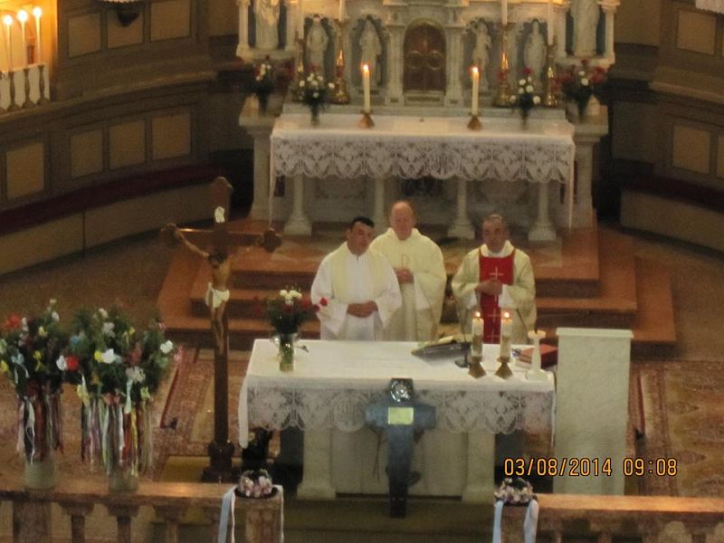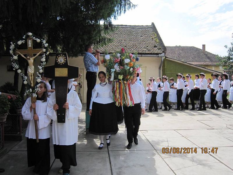 La final, pr. Zillich, în stilul său original, a adresat la rândul său câteva cuvinte credincioşilor şi a interpretat câteva cântece religioase, la acordeon, cântece la care s-au alăturat toţi credincioşii prezenţi. Pe durata întregii Sfinte Liturghii perechile îmbrăcate în port popular au stat, conform tradiţiei, în picioare, pe culoarul din centrul bisericii. Pălăriile băieţilor, împodobite de sărbătoare, au fost aşezate fie la picioarele altarului, pe marginea băncilor sau pe cancellum-ul din faţa altarului. La sfârşitul Sfintei Liturghii, un alt moment tradiţional l-a constituit sfinţirea celor trei buchete de rozmarin, bogat împodobite, ca de hram (Kirchweih), buchete care însoţesc întreaga sărbătoare a comunităţii. La încheiere, alaiul sărbătorii i-a însoţit cu muzică, în procesiune, pe preoţi la casa parohială. (text: Claudiu Călin; foto: Marianne Hellstern)