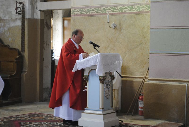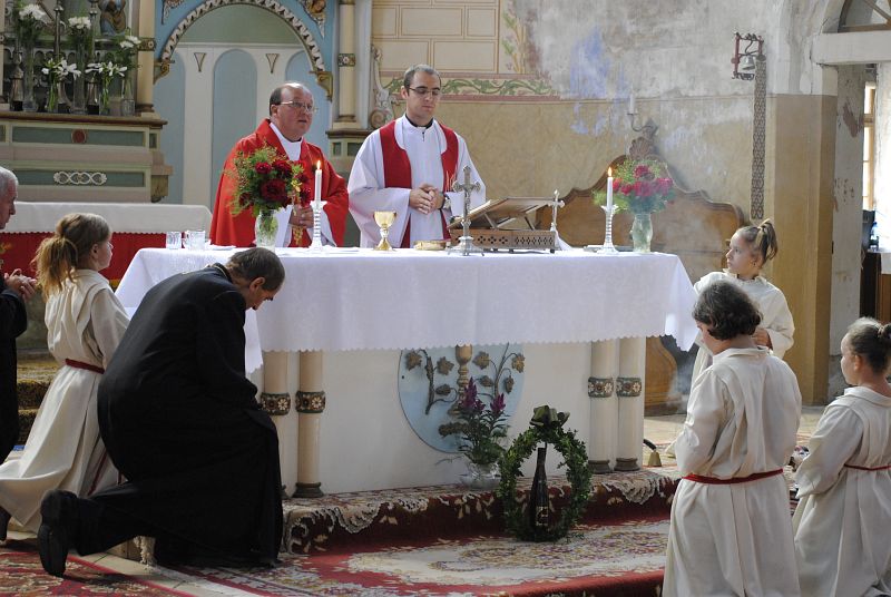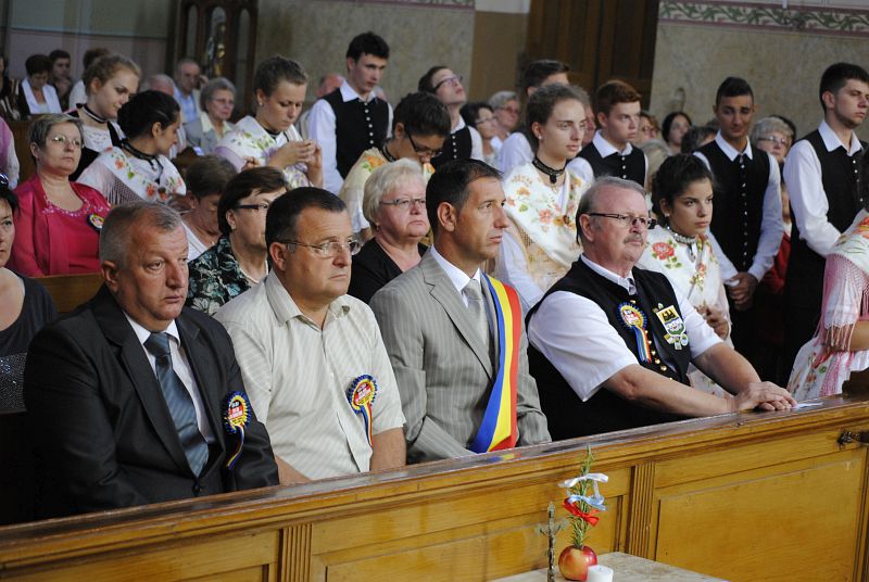 La orele 10.00 clopotele Bisericii au răsunat şi întreaga comunitate împreună cu perechile de tineri şi cu preoţii au întrat împreună în biserică pentru a mulţumi lui Dumnezeu în cadrul Sfintei Liturghii. Jertfa Euharistică a fost celebrată de pr. Attila Andó, paroh de Lipova împreuna cu pr. Macedon Hiticaş şi pr. Dumitru Sabo, parohul greco-catolic de Zăbrani (una dintre cele mai vechi comunităţi greco-catolice din Banat). În cadrul predicii sale, părintele Andó a făcut referire la importanţa Crucii şi acceptării ei în viaţa noastră, aceasta deoarece biserica din Zăbrani este închinată Înălţării Sfintei Cruci. Aşa cum odinioară cei care au venit de departe şi au acceptat orice greutate împreună cu Dumnezeu pentru a construi o comunitate, tot aşa şi pe mai departe trebuie să fim o comunitate unită, în orice greutăţi şi în orice nevoi.