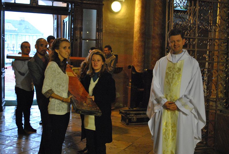 26.10.2014, Timişoara (Catholica) - Joi, 23 octombrie 2014, la o zi după prima comemorare liturgică a Sfântului Papă Ioan Paul al II-lea, cele două simboluri ale Zilelor Mondiale ale Tineretului au ajuns cu bine şi la Timişoara. După ce au fost primite deja pe meleaguri bănăţene, cu o zi înainte, la Lugoj, în Catedrala greco-catolică, crucea şi icoana Sf. Fecioare Maria au fost primite cu bucurie şi venerate şi de tinerii din Timişoara, aceştia sosind într-un număr relativ mare în Domul Sf. Gheorghe (Catedrala romano-catolică) împreună cu Episcopul locului, Excelenţa Sa Martin Roos.