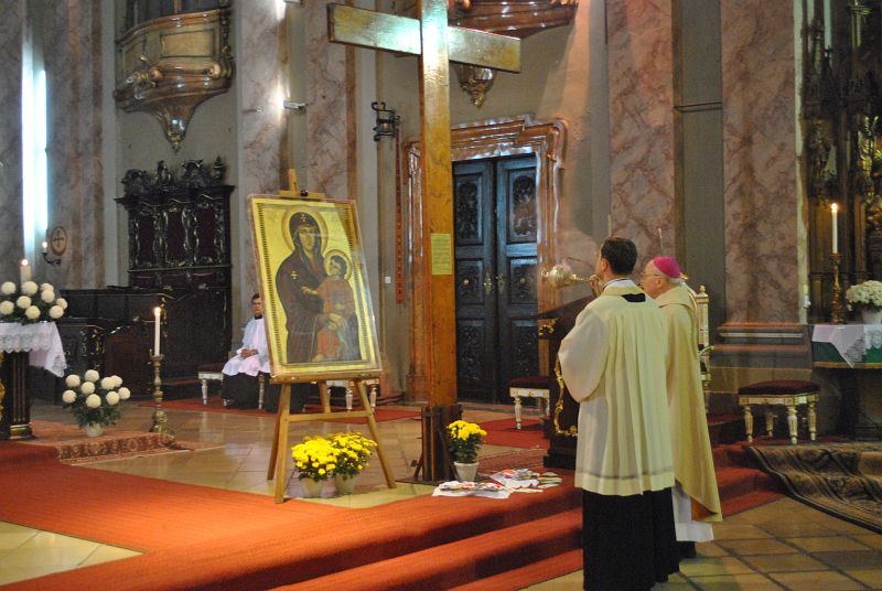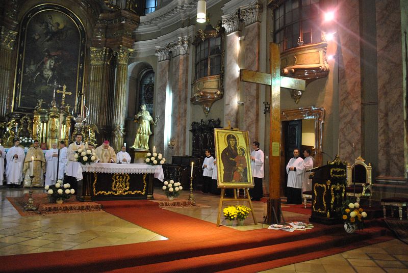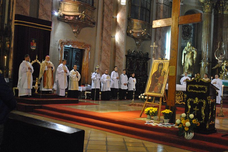 Primirea celor două daruri lăsate tinerilor de Sfântul Papă Ioan Paul al II-lea a avut loc înaintea Sfintei Liturghii celebrate în Dom, cu începere de la orele 18.00. Pe o vreme ploioasă şi rece, dar cu căldură în inimi, un grup de tineri însoţiţi de pr. Felix Roca au purtat cele două simboluri până în faţa altarului Domului. Aici ele au fost primite şi venerate de către Excelenţa Sa Martin Roos, după care au fost aşezate la dreapta altarului. Jertfa euharistică a fost celebrată de către PS Martin Roos, în concelebrare cu un număr de zece preoţi din Timişoara, dar nu numai, veniţi special în acest scop la Dom. Din partea Episcopiei de Lugoj au participat pr. Ovidiu Neiconi, responsabil eparhial pentru tineret, şi pr. Răzvan Oprişa, paroh în Timişoara. Celebrată în cele trei limbi principale ale Diecezei, română, maghiară şi germană, Sfânta Liturghie a cuprins încă de la început un moment de salut din partea Episcopului locului, care a salutat sosirea simbolurilor ZMT, subliniind importanţa şi rolul icoanei Sf. Fecioare Maria, o reprezentare-copie a icoanei Salus Populi Romani din Roma, din Bazilica Santa Maria Maggiore, care prin prezenţa ei la Timişoara, trebuie să fie şi pentru noi prilej de mântuire, de salvare şi de binefacere spirituală.