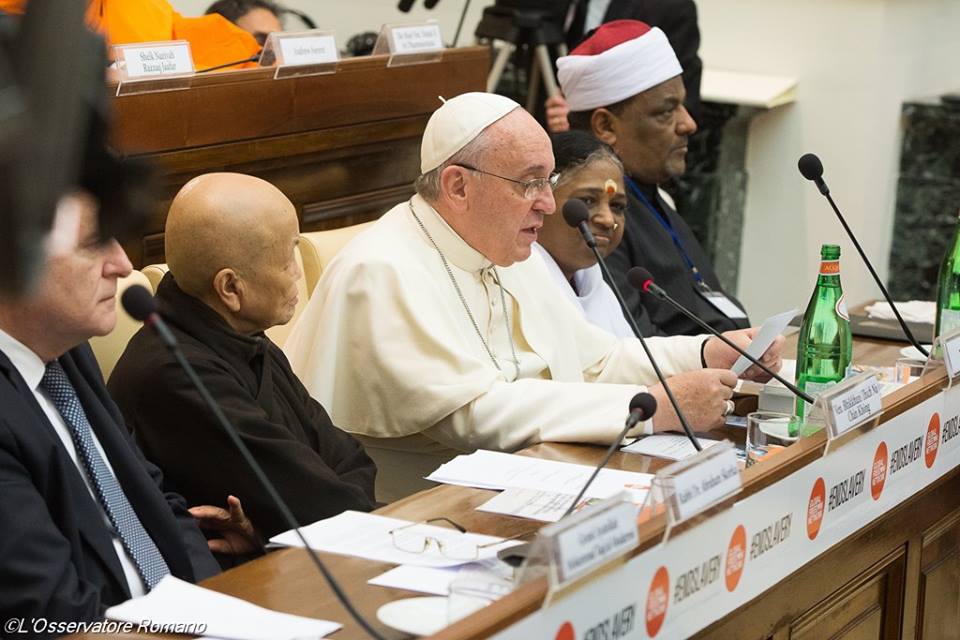 În discursul său, Papa Francisc a început mulţumindu-le tuturor liderilor religioşi pentru angajamentul lor de a asista supravieţuitorii traficului de persoane, şi tuturor celor prezenţi pentru participarea lor activă la acest act de fraternitate, „în special faţă de fraţii noştri care suferă cel mai mult”. „Inspiraţi de confesiunile noastre religioase, ne-am adunat astăzi aici pentru o iniţiativă istorică şi pentru a întreprinde o acţiune concretă: pentru a declara că vom lucra împreună pentru a eradica teribila plagă a sclaviei moderne în toate formele ei. Exploatarea fizică, economică, sexuală şi psihologică a bărbaţilor, femeilor şi copiilor de care suferă actualmente zeci de milioane de oameni constituie o formă de dezumanizare şi umilire.”