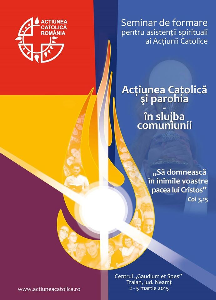 25.02.2015, Traian (Catholica) - În perioada 2-5 martie 2015, la Centrul „Gaudium et Spes” din loc. Traian, jud. Neamţ, se va desfăşura Seminarul de formare pentru asistenţii spirituali cu tema „Acţiunea Catolică şi parohia – în slujba comuniunii”, sub mottoul „Să domnească în inimile voastre pacea lui Cristos” (Col 3,15) organizat de Federaţia Acţiunea Catolică din România (ACRO).