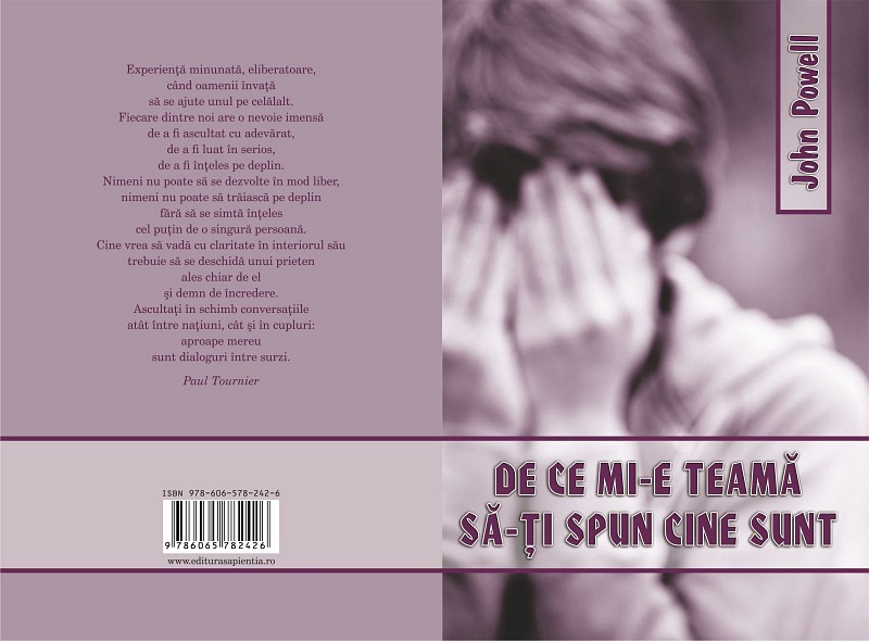 24.02.2016, Iași (Catholica) - La Editura Sapientia din Iași a apărut recent cartea De ce mi-e teamă să-ți spun cine sunt, scrisă de John Powell, SJ, și tradusă în limba română de Iudita Iacob și de pr. dr. Iosif Iacob. Cartea apare în colecția „Creștinism în contemporaneitate”, formatul 14×20 cm, are 112 pagini și poate fi procurată de la Librăria Sapientia (www.librariasapientia.ro), precum și de la celelalte librării catolice din țară la prețul de 10 lei.
