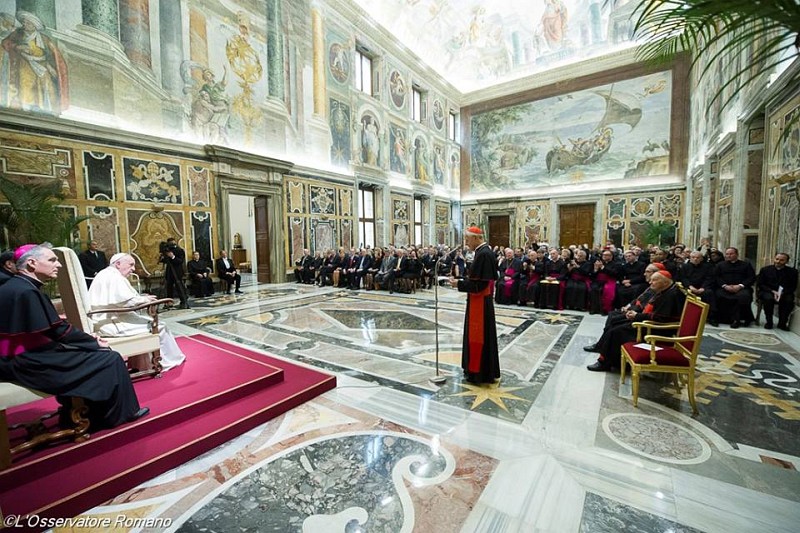 Fundația Papală a fost înființată de clerici și laici americani în 1988, ca o cale de susținere a priorităților caritabile ale Sfântul Părinte. Fondul de 215 milioane de dolari oferă o sursă continuă de venit, dar niciodată banii nu sunt investiți în companii care desfășoară activități ce nu sunt conforme cu credința catolică. Peste 15 milioane de dolari au fost distribuiți în 2015 pentru case, spitale, instituții educaționale și programe pro-life din toată lumea. Din 1988, au fost dați pentru caritate peste 121 de milioane de dolari. Papa Francisc a încheiat audiența rugându-se ca membrii Fundației să trăiască un nou impuls spre sfințenie prin pelerinajul lor, și mai ales să trăiască darul milostivirii lui Dumnezeu.