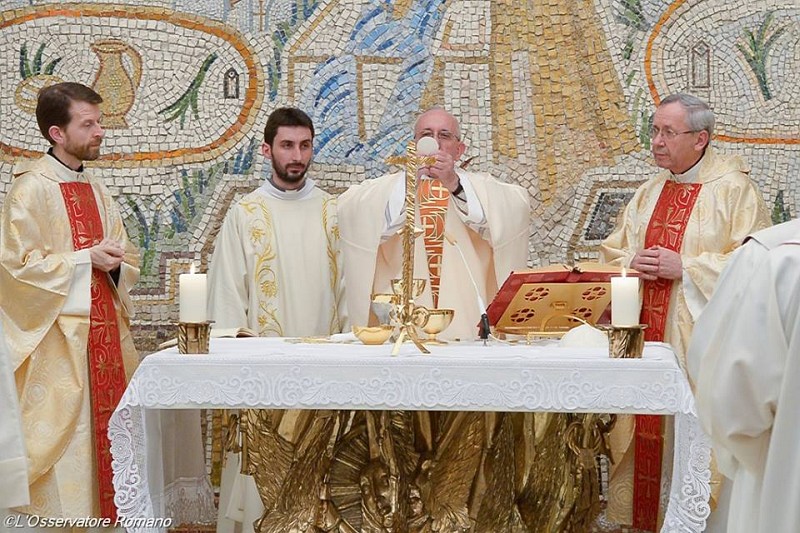 11.04.2016, Vatican (Catholica) - Papa Francisc a celebrat vineri, 8 aprilie 2016, după-amiază, o Sfântă Liturghie în Capela Redemptoris Mater, din Palatul Apostolic, cu ocazia împlinirii a 25 de ani de la fondarea Centrului de Studii și Cercetare „Ezio Aletti”. Fondat de preotul iezuit Marko Ivan Rupnik, imediat după căderea regimurilor comuniste în țările Europei de Est, Centrul Aletti aniversează totodată 20 de ani de la fondarea Atelierului de Artă, legat de același centru. Splendidele mozaicuri ce împodobesc Capela Redemptoris Mater au fost concepute și realizate chiar de pr. Rupnik, citim în relatarea de pe situl Radio Vatican.