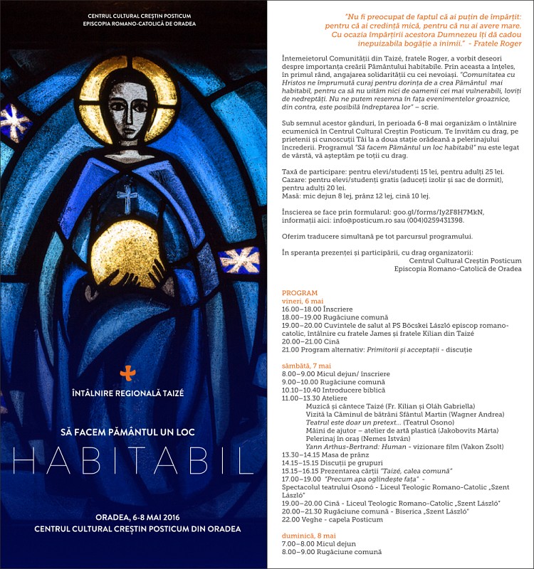 28.04.2016, Oradea (Catholica) - Întemeietorul Comunității din Taizé, fratele Roger, a vorbit deseori despre importanța creării Pământului habitabile. Prin aceasta a înțeles, în primul rând, angajarea solidarității cu cei nevoiași. „Comunitatea cu Hristos ne împrumută curaj pentru dorința de a crea Pământul mai habitabil, pentru ca să nu uităm nici de oamenii cei mai vulnerabili, loviți de nedreptăți. Nu ne putem resemna în fața evenimentelor groaznice, din contra, este posibilă îndreptarea lor” – scrie. Sub semnul acestor gânduri, în perioada 6-8 mai 2016 Episcopia Romano-Catolică și Centrul Cultural Creștin Posticum organizează o întâlnire ecumenică la Oradea, str. Teiului 26. Programul detaliat și alte informații puteți găsi în invitația atașată.