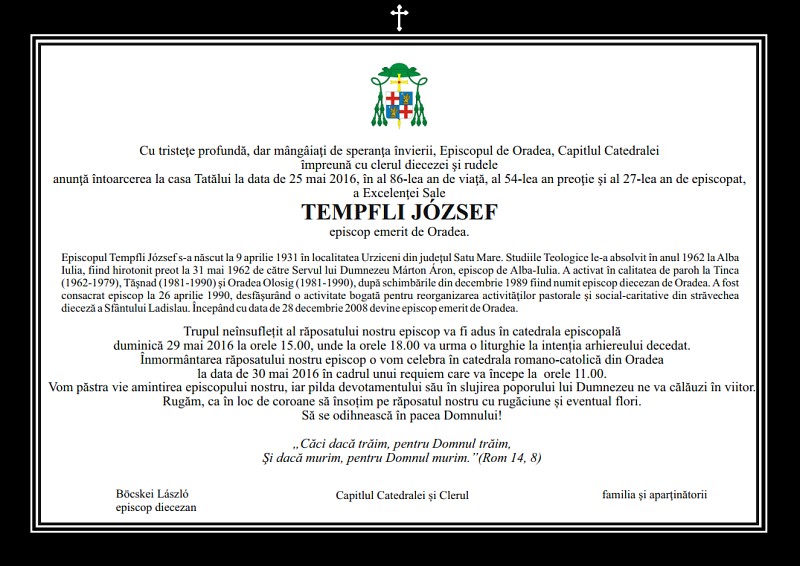 25.05.2016, Oradea (Catholica) - Episcopul Böcskei László al Diecezei Romano-Catolice de Oradea, Capitlul Catedralei și Clerul, împreună cu familia și aparținătorii, semnează următorul necrolog în urma decesului astăzi a PS Tempfli József, Episcop emerit de Oradea: Cu tristețe profundă, dar mângâiați de speranța învierii, Episcopul de Oradea, Capitlul Catedralei, împreună cu clerul Diecezei și rudele, anunță întoarcerea la casa Tatălui la data de 25 mai 2016, în al 86-lea an de viață, al 54-lea an preoție și al 27-lea an de episcopat, a Excelenței Sale Tempfli József, Episcop emerit de Oradea.