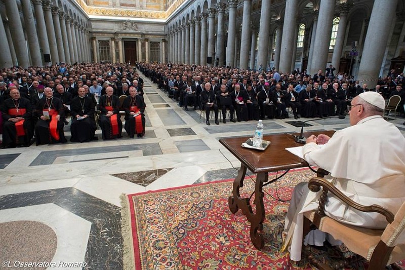 03.06.2016, Vatican (Catholica) - A fi milostiv, în special pentru un preot, nu înseamnă a face acte izolate de milostivire. A fi milostiv nu este un mod de viață ci modul de viață. Nu există altă cale pentru un preot. Afirmațiile au fost făcute la a treia meditație oferită de Papa Francisc în după-amiaza zilei de ieri, cu titlul „Bunul miros al lui Cristos și lumina milostivirii Sale”, pentru Jubileul Preoților și Seminariștilor (1-3 iunie). Meditația susținută în Bazilica San Paolo fuori le mura de la 4PM a fost parte a reculegerii cu tema „Bunul Păstor: Preotul ca ministru al milostivirii și compasiunii, aproape de oamenii săi și slujitor al tuturor”. Meditațiile anterioare au fost oferite de Pontif tot joi, 2 iunie, de la 10AM în Bazilica San Giovanni in Laterano, iar de la 12.00 în Bazilica Santa Maria Maggiore.