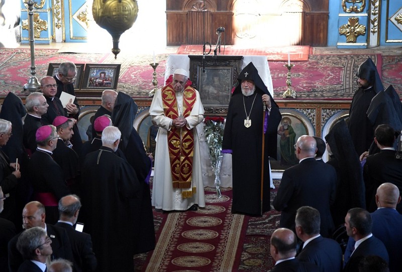 26.06.2016, Gyumri (Catholica) - Pentru după-masa celei de-a doua sa zile în Armenia, agenda Papei Francisc a inclus o vizită la Catedrala apostolică și la Catedrala catolică din Gyumri, al doilea oraș ca populație din această țară. După Liturghia de dimineață, celebrată în aer liber în piața centrală din Gyumri, Pontiful a mers la aeroport pentru a se întoarce la Erevan pentru întâlnirea ecumenică și rugăciunea pentru pace din Piața Republicii din capitală. Dar în drum s-a oprit mai întâi la Catedrala apostolică armeană a Preasfintei Mamei a lui Dumnezeu.