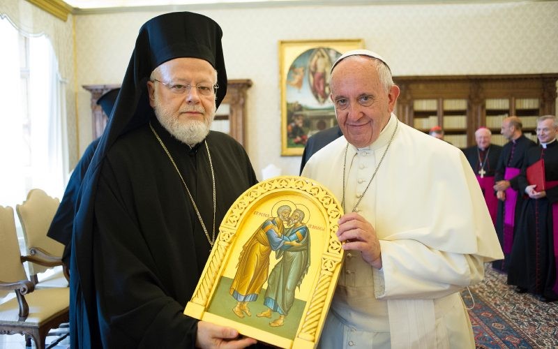29.06.2016, Vatican (Catholica) - Marți, 28 iunie 2016, Papa Francisc a primit în audiență delegația Patriarhiei Ecumenice din Constantinopol, venită conform tradiției la Roma cu ocazia solemnității Sfinții Apostoli Petru și Paul. Delegația trimisă de Sanctitatea Sa Bartolomeu I este condusă de Mitropolitul Metodiu de Boston, însoțit de Arhiepiscopul Job de Telmessos și de diaconul patriarhal Nephon Tsimalis. Întâlnirea cu delegația de la Constantinopol are loc la foarte scurt timp după încheierea Sfântului și Marelui Conciliu al Bisericii Ortodoxe, Pontiful asigurând că „împreună cu foarte mulți frați și surori catolici și creștini din alte Biserici, am însoțit cu rugăciunea pregătirea proximă și desfășurarea Conciliului”.