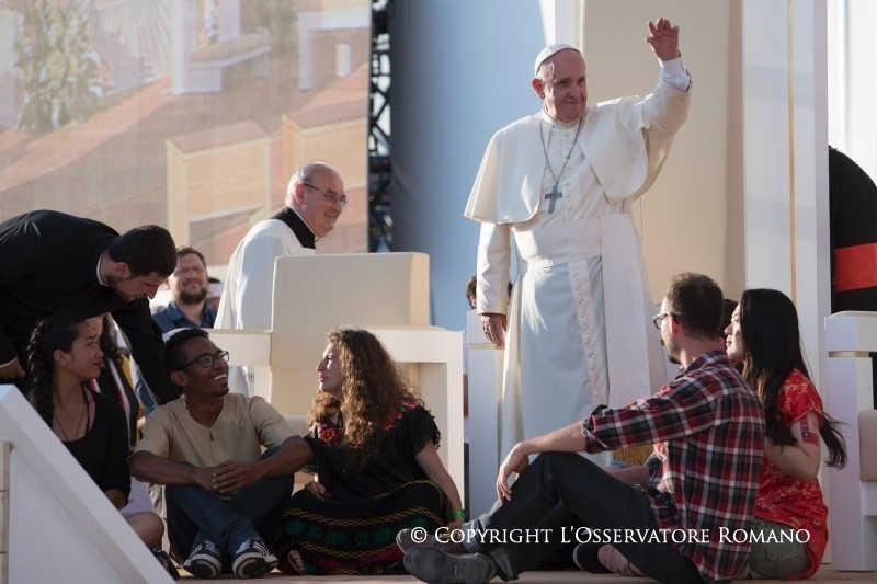A avertizat împotriva capcanei închiderii, spunând că tinerii pot da exemplu adulților prin modul în care au conviețuit în aceste zile, în multiculturalitatea întâlnirii. Și a invitat la zidirea de punți, prima fiind prin unirea mâinilor tinerilor prezenți pe „Campus Misericordiae”. Da, a admis Papa, există riscul ca întinzând mâna să rămâi cu ea în aer, „dar în viață trebuie riscat; cine nu riscă nu învinge”. Și a încheiat spunând: „Domnul să binecuvânteze visele voastre.”