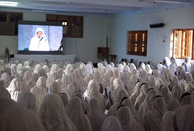 05.09.2016, Calcutta (Catholica) - În Shishu Bhavan (Casa Copiilor), copiii, săracii, călugărițele și novicele Misionare ale Carității au urmărit în tăcere transmisiunea în direct a ceremoniei din Vatican de canonizare a Maicii Tereza, de duminică, 4 septembrie 2016, în timp ce mulți s-au rugat la mormântul noii sfinte. „Este o zi de sărbătoare pentru noi. Frații și surorile Misionari ai Carității urmăresc aceasta în toate casele noastre, dar multe surori vizitează sediul central, pentru Liturghia specială de mulțumire, în această seară”, a declarat sora Benoy, care a venit din casa din suburbia Dum Dum pentru a le ajuta pe surori cu numărul mare de vizitatori.