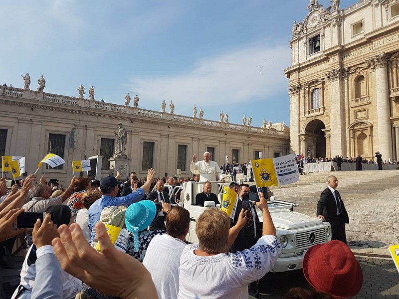 12.09.2016, Vatican (Catholica) - „Adresez un cordial salut pelerinilor din România însoțiți de câțiva Episcopi în pelerinaj la Roma cu ocazia Anului Sfânt al Milostivirii. Iubiți frați și surori, a înfăptui milostivirea înseamnă a sluji viața și comuniunea. Fiecare dintre noi poate fi ferment de viață și mijloc de comuniune în familia sa, la locul de muncă, în parohie și în grupul de apartenență. Vă invit să fiți în viața zilnică un semn vizibil al milostivirii lui Dumnezeu care nu lasă pe nimeni în singurătate și în nevoie. Întăriți prin rugăciune și prin fapte de caritate, să mergem înainte împreună cu toți creștinii pe drumul spre unitate. Vă binecuvântez din inimă pe voi și familiile voastre. Contez pe rugăciunile voastre pentru mine. Lăudat să fie Isus Cristos!”
