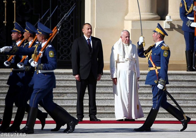 Pontiful s-a întâlnit cu președintele republicii Azerbaidjan, Ilham Aliyev, cu soția sa, cu autorități și membri ai corpurilor diplomatice, în cadrul vizitei de trei zile în Georgia și Azerbaidjan, ambele țări cu o prezență catolică minoră. Se estimează că în țara vizitată astăzi de Papă ar fi 600-700 de romano-catolici, doar 200 dintre ei având cetățenie, majoritatea țării fiind șiită. „Sunt bucuros să vizitez Azerbaidjanul și vă mulțumesc pentru călduroasa primire în acest oraș, în capitala țării, pe malurile Mării Caspice”, a spus el, indicând spre transformarea orașului cu noi clădiri, inclusiv noul Centru Heydar Aliyev, unde a avut loc întâlnirea. A amintit că pe 18 octombrie țara celebrează 25 de ani de independență de Uniune Sovietică. „Această ocazie oferă posibilitatea de a privi atent la aceste decenii, la progresul atins și la provocările pe care le are în față țara”, a spus el.