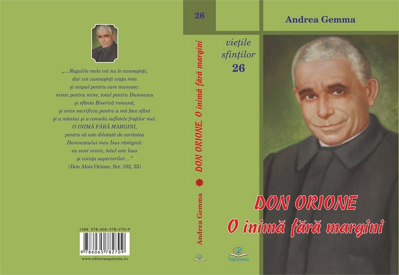 13.11.2016, Iași (Catholica) - Editura Sapientia din Iași anunță apariția cărții Don Orione. O inimă fără margini, scrisă de Andrea Gemma și tradusă de pr. dr. Mihai Pătrașcu. Cartea apare în colecția „Viețile sfinților” în formatul 14×20 cm, are 560 pagini și poate fi procurată de la Librăria Sapientia (www.librariasapientia.ro), precum și de la orice librărie catolică din țară la prețul de 30 lei.
