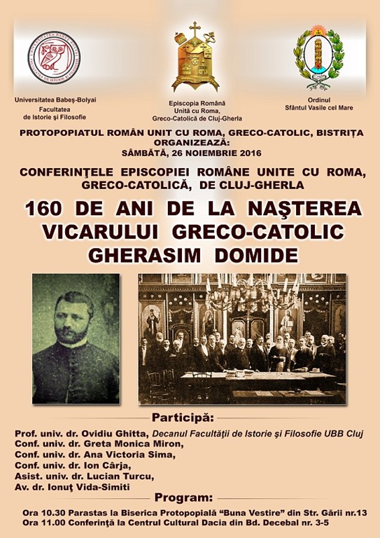 Manifestarea de la Bistrița, organizată în cadrul protopopiatului greco-catolic Bistrița, este pusă sub genericul „160 de ani de la nașterea lui Gherasim Domide” și urmează să se desfășoare în data de 26 noiembrie a.c., de la ora 11.00, în sala „Valeria Peter Predescu” a Centrului Cultural „Dacia”, (bd. Decebal, nr. 3-5).