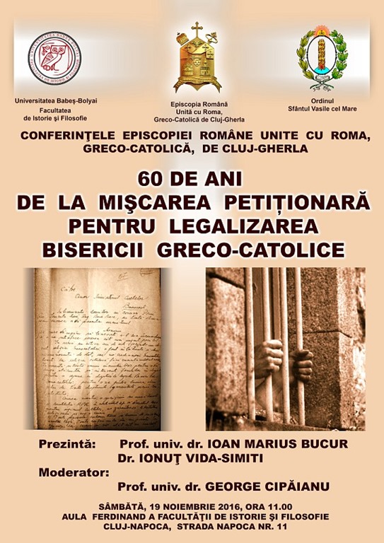 Manifestarea de la Cluj-Napoca este pusă sub genericul „60 de ani de la mișcarea petiționară pentru legalizarea Bisericii Greco-Catolice” și urmează să se desfășoare în data de 19 noiembrie a.c., de la ora 11.00, în Aula „Regele Ferdinand I” a Facultății de Istorie și Filosofie (str. Napoca, nr. 11). În cadrul acestui eveniment vor susține comunicări dl. prof. univ. dr. Ioan-Marius Bucur și dl. av. dr. Ionuț Vida-Simiti, moderator al sesiunii fiind dl. prof. univ. dr. George Cipăianu.