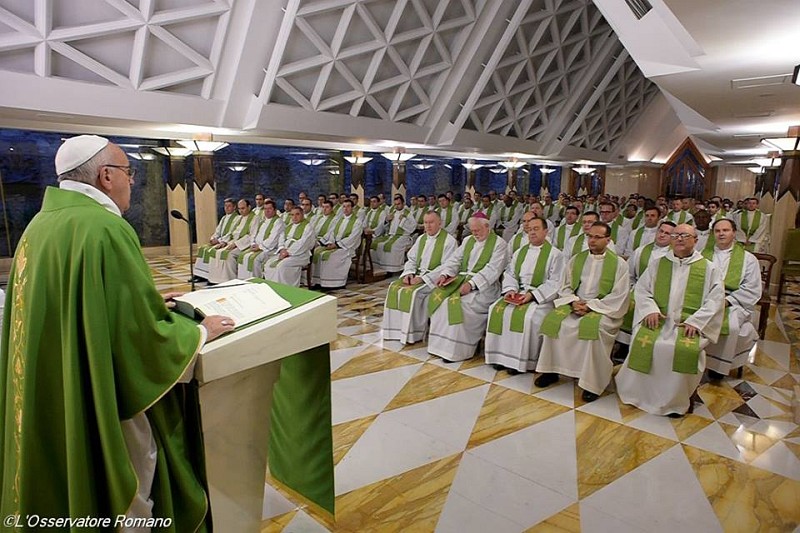 În același registru de reflecție, Pontiful a amintit idolii ținuți ascunși de Rahela, soția lui Iacob, și a îndemnat la examinarea atentă a conștiinței pentru a evita un sfârșit trist, în prezența unor persoane avide de bani. „Este trist să vezi un preot ajuns la capătul vieții, care este în agonie, în comă, iar nepoții vin ca niște vulturi în locuința lui pentru a vedea ce pot lua. Faceți-i Domnului plăcerea unui autentic examen de conștiință… Fie ca Domnul să ne dea harul sărăciei muncitorilor, a celor care lucrează și primesc câștigul just fără să caute să obțină mai mult.”