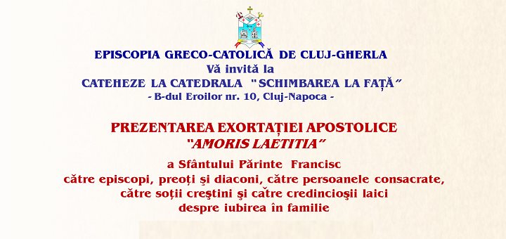 22.02.2017, Cluj (Catholica) - Episcopia Greco-Catolică de Cluj-Gherla anunță organizarea, în timpul Postului Paștelui, a unui ciclu de cateheze, care vor fi susținute de două ori pe săptămână, de la ora 19.30, după Liturghia Darurilor mai Înainte Sfințite (programată la ora 18), în Catedrala Schimbarea la Față (B-dul Eroilor nr. 10, Cluj-Napoca). Programul, în ansamblul său, propune credincioșilor Prezentarea Exortației apostolice Amoris laetitia a Papei Francisc.
