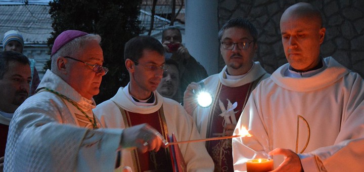 Vigilia vigiliilor, adică celebrarea solemnă a Învierii Domnului a început sâmbătă seara, la ora 20.00, prin aprinderea și binecuvântarea focului, de la care apoi a fost aprinsă lumânarea pascală, purtată în procesiune spre altarul Catedralei, unde va rămână până la Solemnitatea Coborârii Duhului Sfânt. După proclamarea solemnă a Învierii de Reghina Nadkrenicinîi, au urmat patru lecturi din Vechiul Testament, care conțineau marea taină celebrată în acea seară, după care Episcopul a intonat Gloria, clopotele reluându-și cântarea. După Evanghelie și predica păstorului nostru, a urmat Liturgia baptismală, când doi catecumeni au primit Sfânta Taină a Botezului, alți doi credincioși primind plinătatea Duhului Sfânt prin Confirmațiune. După tradiție, la sfârșitul Liturghiei, Isus din Euharistie a fost purtat în procesiune în jurul sfântului lăcaș, după care credincioșii, primind binecuvântarea, s-au îndreptat spre casele lor ca să continue bucurie Învierii, nu înainte de a le fi binecuvântate bucatele aduse. (pr. Petru Ciobanu pentru CatolicMold.md)