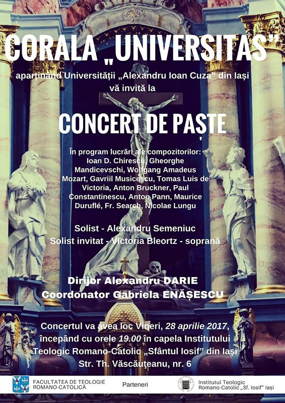 22.04.2017, Iași (Catholica) - Corala „Universitas” a Universității „Alexandru Ioan Cuza” din Iași, în parteneriat cu Facultatea de Teologie Romano-Catolică și Institutul Teologic Romano-Catolic din Iași, organizează un Concert de Paști.