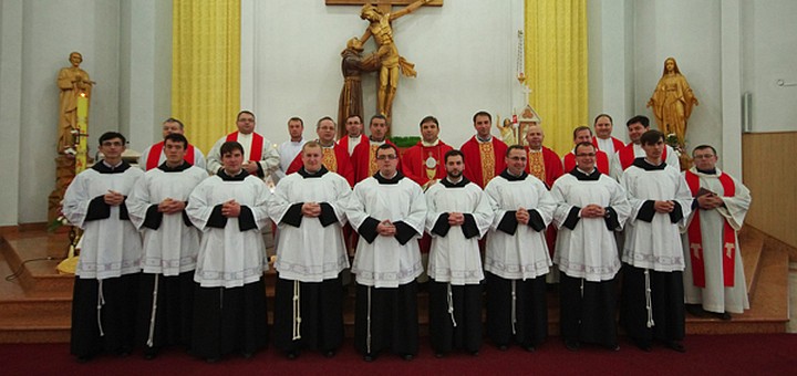 26.04.2017, Roman (Catholica) - Ziua de 25 aprilie 2017, zi în care a fost sărbătorit Sf. Marcu evanghelistul, a reprezentat pentru Provincia Franciscană și pentru Institutul Teologic Romano-Catolic Franciscan din Roman un moment de bucurie, întrucât 9 frați studenți, în cadrul Sfintei Liturghii prezidate de Ministrul provincial, fr. Teofil Petrișor, au primit un dar deosebit ce a constat în instituirea lor ca lectori și acoliți – 5 lectori și 4 acoliți, aflăm din materialul de pe OFMConv.ro. În cadrul predicii, fr. Teofil Petrișor a subliniat însemnătatea acestui moment și, potrivit Evangheliei zilei, importanța dăruirii în slujirea Domnului.