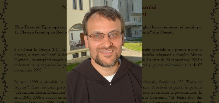 29.08.2017, Oneşti (Catholica) - Prin Decretul Episcopal nr. 2422 din 23 august 2017, PS Petru Gherghel l-a recunoscut și numit pe fr. Flavian Gondoș ca rector al Sanctuarului diecezan „Fericitul Ieremia” din Onești. S-a născut la Onești (BC), la data de 11 aprilie 1974. După terminarea școlii generale și a primei trepte la Onești, a terminat liceul la Seminarul Franciscan din Roman. A intrat în familia religioasă a Fraților Minori Capucini, parcurgând etapele de formare în Provincia capucinilor din Napoli. La data de 25 septembrie 1993 a îmbrăcat haina capucină iar pe 18 septembrie 1994 a emis profesiunea simplă și pe cea solemnă în ziua de 5 decembrie 1998.