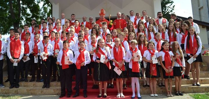 14.09.2017, Iași (Catholica) - Duminică, 10 septembrie 2017, începând cu ora 11.00, în cadrul Sfintei Liturghii prezidată de Excelența Sa Aurel Percă, Episcop auxiliar al Diecezei de Iași, alături de care au concelebrat pr. Sorin-Adrian Giurgi, vicar provincial al Fraților Minori Conventuali din România, pr. decan Gabriel Farcaș și un număr de 20 de preoți, a avut loc administrarea Sacramentului Mirului la 69 de candidați, 56 de candidați din parohia „Preasfânta Treime” din Prăjești și 13 candidați din filiala Bogdănești, „Sfântul Mihail, Arhanghelul”.