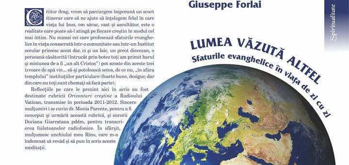 18.10.2017, Iași (Catholica) - La Editura Sapientia din Iași a apărut recent cartea Lumea văzută altfel. Sfaturile evanghelice în viața de zi cu zi, scrisă de Giuseppe Forlai și tradusă în limba română de Daniel Hrișcă. Cartea apare în colecția „Spiritualitate”, în format 14×20, are 70 de pagini și poate fi procurată de la Librăria Sapientia (www.librariasapientia.ro), precum și de la celelalte librării catolice din țară la prețul de 10 lei.
