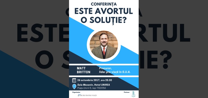 24.10.2017, Iași (Catholica) - Pe 26 octombrie, pentru prima oară în România, Matt Britton (SUA), procuror general, președinte al consiliului 40 Days for Life – cea mai mare mișcare pro-viață la nivel mondial – vorbește despre libertatea de a alege avortul și implicațiile ei, începând cu ora 20.00, în Sala Mezanin, la Hotel UNIREA din Iași. Conferința va avea un timp semnificativ rezervat întrebărilor și discuțiilor libere.