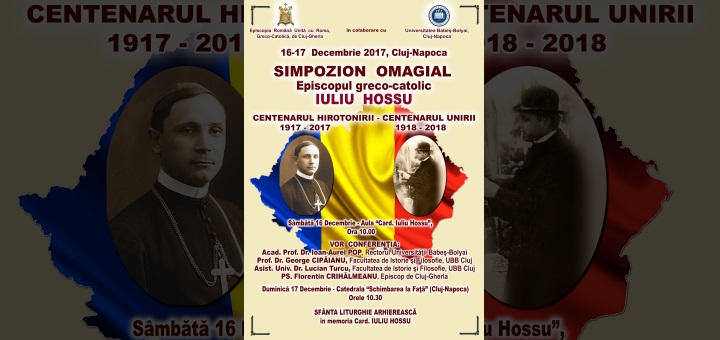 09.12.2017, Cluj (Catholica) - Episcopia Română Unită cu Roma, Greco-Catolică, de Cluj-Gherla, în colaborare cu Universitatea Babeș-Bolyai, organizează la Cluj-Napoca Simpozionul omagial: Episcopul greco-catolic Iuliu Hossu, Centenarul hirotonirii (1917-2017) – Centenarul Unirii (1918-2018), cu ocazia centenarului episcopatului PS Iuliu Hossu și a aniversării, împreună cu întreaga țară, a centenarului Unirii Transilvaniei cu România, pe care Ierarhul greco-catolic a vestit-o mulțimilor adunate la Alba Iulia.