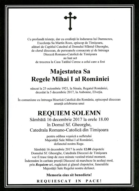 Sâmbătă 16 decembrie 2017 la orele 18.00 în Domul Sf. Gheorghe, Catedrala Romano-Catolică din Timișoara pentru odihna veșnică a sufletului Majestății Sale Mihai I al României, defunctul nostru Rege. Sâmbătă, 16 decembrie 2017, la orele 12.00 clopotele Domului Sf. Gheorghe, Catedrala Diecezei de Timișoara vor fi trase timp de zece minute vestind tristul moment.