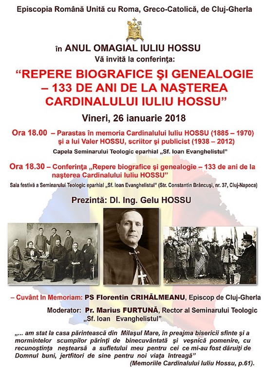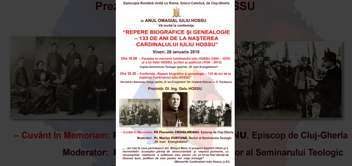 23.01.2018, Cluj (Catholica) - Cu ocazia Anului omagial dedicat Cardinalului Iuliu Hossu – 2018, An al Centenarului Marii Uniri, Episcopia Greco-Catolică de Cluj-Gherla organizează vineri, 26 ianuarie 2018, o seară de rugăciune și evocare dedicată Vestitorului Unirii de la Alba Iulia – marele Episcop român unit cu Roma, dr. Iuliu Hossu, cu accentul pe prima parte a vieții sale, ca fiu al unei frumoase familii preoțești, apoi ca tânăr preot și Episcop. Programul se va desfășura în Sala festivă a Seminarului Teologic eparhial „Sf. Ioan Evanghelistul” (str. Constantin Brâncuși, nr. 37), Cluj-Napoca.