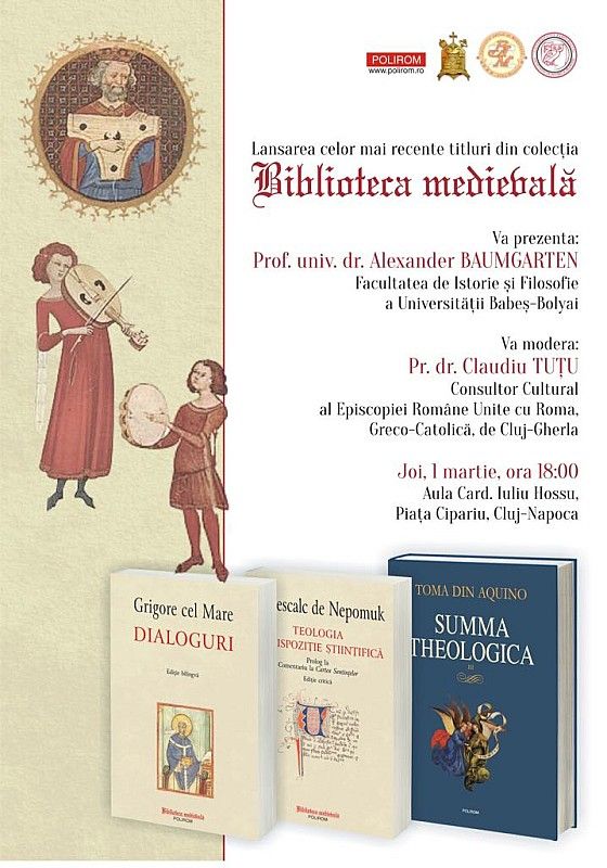 25.02.2018, Cluj (Catholica) - Episcopia Română Unită cu Roma, Greco-Catolică, de Cluj-Gherla, în colaborare cu Editura Polirom, Centrul de Filosofie Antică și Medievală și Facultatea de Istorie și Filosofie a Universității Babeș-Bolyai din Cluj-Napoca vă invită la evenimentul lansării celor mai recente titluri din literatura patristică și medievală, în data de 1 martie 2018, ora 18.00, în Aula Card. Iuliu Hossu, din Piața Cipariu, Cluj-Napoca.