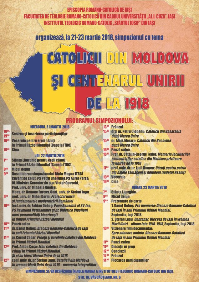 07.03.2018, Iași (Catholica) - Episcopia Romano-Catolică de Iași, în colaborare cu Facultatea de Teologie Romano-Catolică din cadrul Universității „Al.I.Cuza” din Iași și cu Institutul Teologic Romano-Catolic „Sfântul Iosif” din Iași, organizează simpozionul național „Catolicii din Moldova și Centenarul Unirii de la 1918”. Evenimentul va avea loc în Aula Magna a Institutului Teologic Romano-Catolic din Iași, în zilele de 21-23 martie 2018.