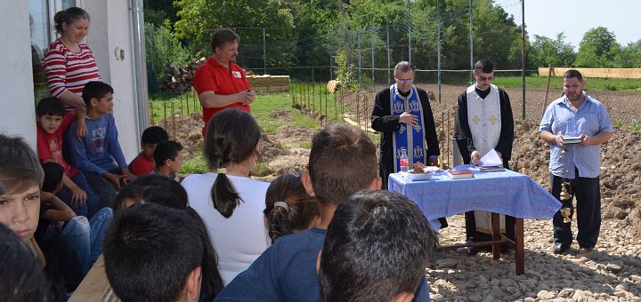 03.05.2018, Oradea (Catholica) - Asociația Caritas Eparhial Oradea a pus, în Ioaniș, piatra de temelie a viitorului centru de zi „Sfântul Martin”, miercuri, 2 mai 2018. Slujba de sfințire a locului a fost oficiată de părintele protopop Zima Zorel și părintele paroh Boța Mircea, în prezența copiilor, beneficiari ai viitorului centru, a președintelui asociației, a responsabilului de proiect, Adela Popa-Ghițulescu și ai angajaților asociației.