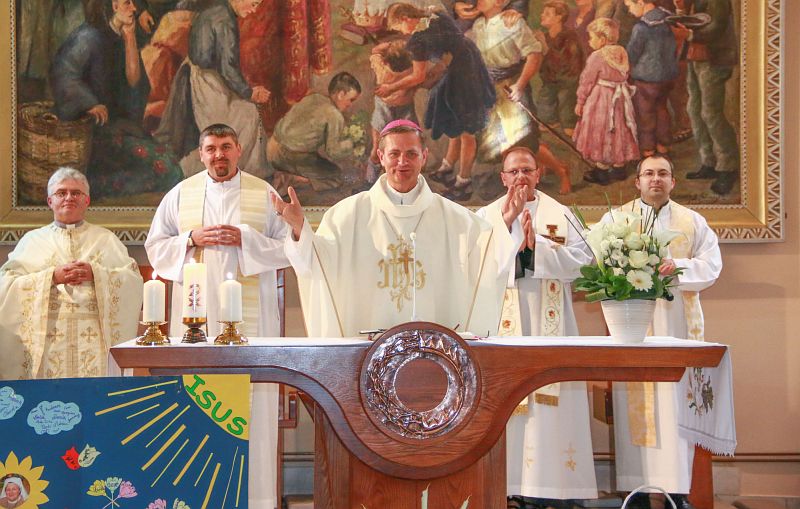 La începutul Sfintei Liturghii, Episcopul Eugen Schönberger, cu prilejul sărbătorii Preasfintei Inimi a lui Isus, a mulțumit lui Dumnezeu pentru dragostea pe care o are față de oameni și pe care o emană neîncetat din inima străpunsă a Fiului Său. În predica sa, Preasfinția Sa le-a amintit enoriașilor că dacă vor o inimă creștină adevărată, plină de bogăție cerească, asemenea cu Inima lui Isus, este necesar să ceară ajutorul Preacuratei Fecioare Maria. „La Nazaret, între Isus și Maria s-a închegat o viață atât de intimă, de armonioasă, cum nu s-a mai văzut niciodată pe pământ. Intimitatea se reflecta prin cuvinte puține și multă tăcere, completate de gesturi simple, pline de iubire. Înainte însă de a vorbi de o intimitate statornicită între aceste două inimi, trebuie să spunem că și aici a existat o evoluție, o formare progresivă a Inimii lui Isus în atmosfera caldă a unei inimi de mamă, fiindcă tocmai Mariei i-a fost încredințată misiunea extraordinară, nemaipomenită, de a forma o inimă omenească pentru Fiul lui Dumnezeu.”
