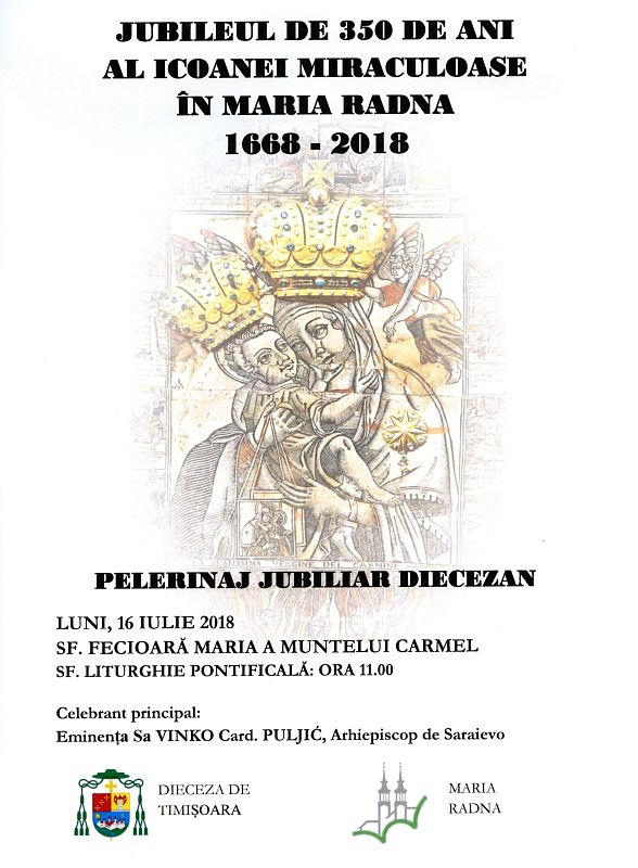 12.07.2018, Timișoara (Catholica) - 1. În acest an se împlinesc 350 de ani de prezență a Icoanei Miraculoase la Maria Radna. Cu prilejul acestei aniversări luni, 16 iulie 2018, în Bazilica din Maria Radna va avea loc un pelerinaj diecezan jubiliar. Răspunzând invitației adresate de către Excelența Sa Martin Roos, Episcop și administrator apostolic de Timișoara, celebrantul principal al Sfintei Liturghii de la orele 11.00 va fi Eminența Sa Vinko Cardinal Puljić, Arhiepiscop de Saraievo.